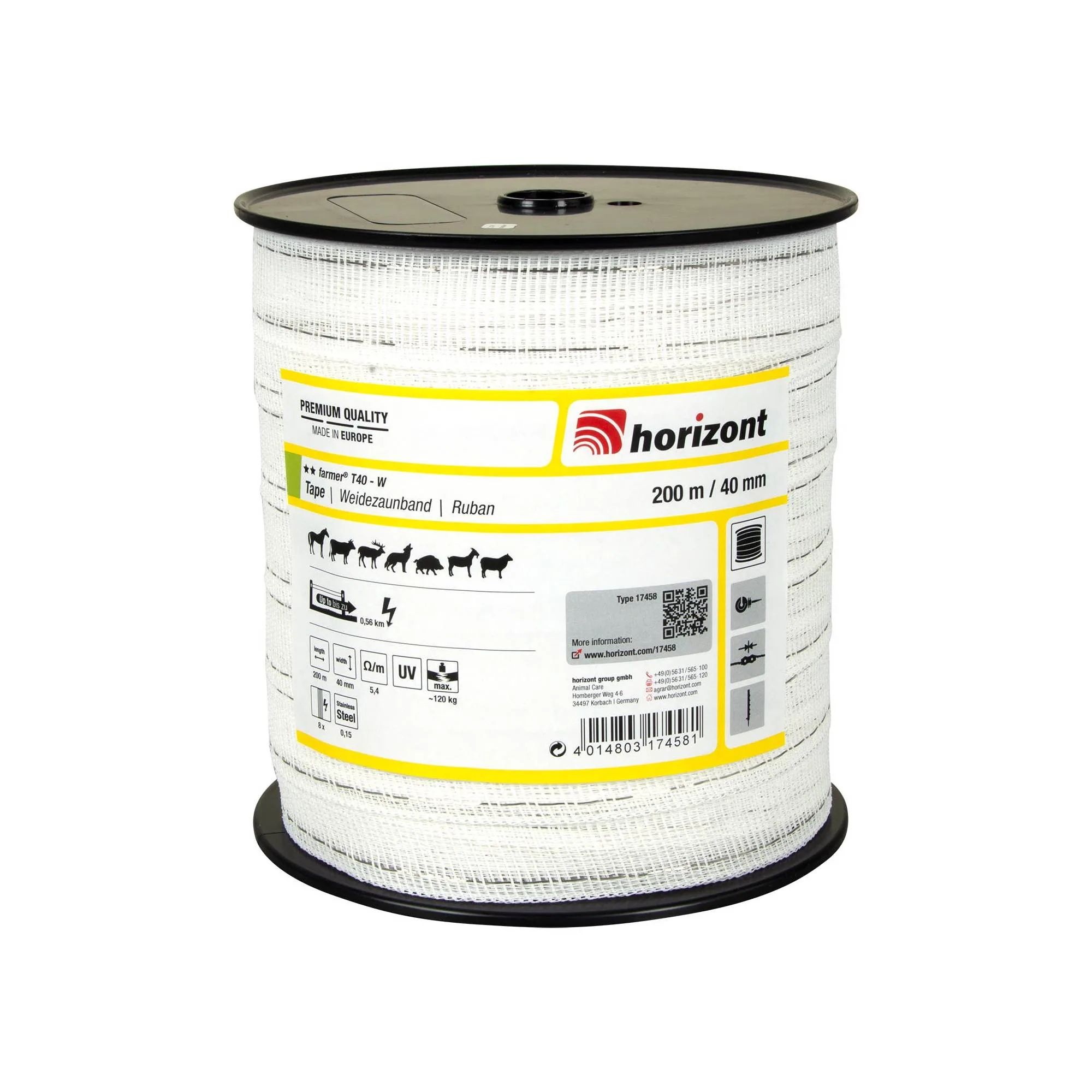 Električna traka Farmer u bijeloj boji, duljine 200 m i širine 40 mm. Zbog svoje boje, traka je dobro vidljiva u sumrak ili tami.