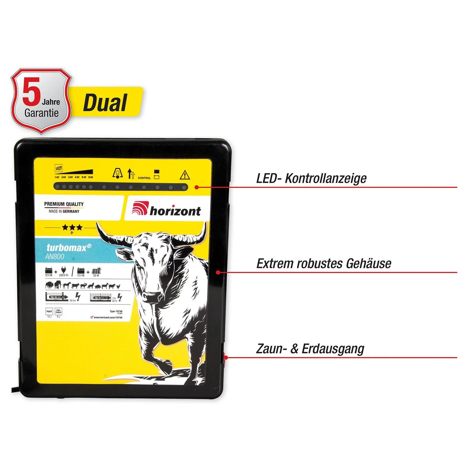 Električni pastir Horizont Turbomax AN800 Dual je uređaj koji se može istovremeno priključiti na električnu mrežu 230V i na 12V/230Ah akumulator. Ovaj električni pastir se može, uz dokup 12V akumulatora i 50W solarnog panela, nadograditi, tako da uporaba postane ekonomičnija. U slučaju nestanka električne mreže, uređaj radi neprekidno, do ponovne uspostave.