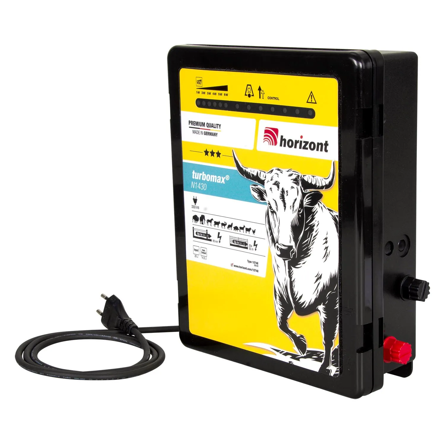 Električni pastir Horizont Turbomax N1430 je izdelan iz visoko kvalitetne plastike in je odporen na UV žarke, stik z olji, udarce, stik z vodo in imajo torzijsko odpornost. To zagotavlja, da bo električni pastir zanesljivo delal več let, kar potrjuje 5 let garancije na izdelek. Testirano in narejeno v skladu z veljavno EU zakonodajo in varnostnimi standardi EN 60335-7-76 in DIN EN ISO 9001.