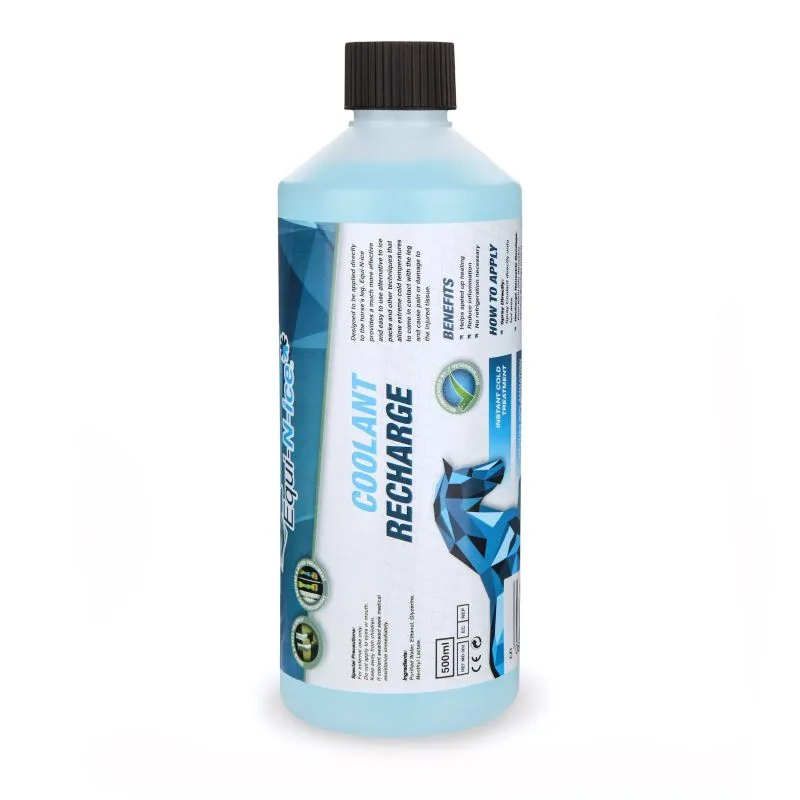 Equi’N’ice – Coolant recharge hladilna tekočina. Takojšnje hladilno zdravljenje. Zmanjša vnetja in udarnine. Obdela težavna področja, kolena in skočne sklepe. Zagotovljeno, da bo vaš konj hitreje okreval. Priporočljivo za hlajenje po delu, zasnovan za neposredno nanašanje na konjsko nogo, zagotavlja veliko bolj učinkovito in enostavno alternativo ledenim obkladkom in drugim tehnikam, ki omogočajo, da ekstremno nizke temperature pridejo v stik z nogo in morebitno povzročijo bolečino ali poškodbo tkiva.
