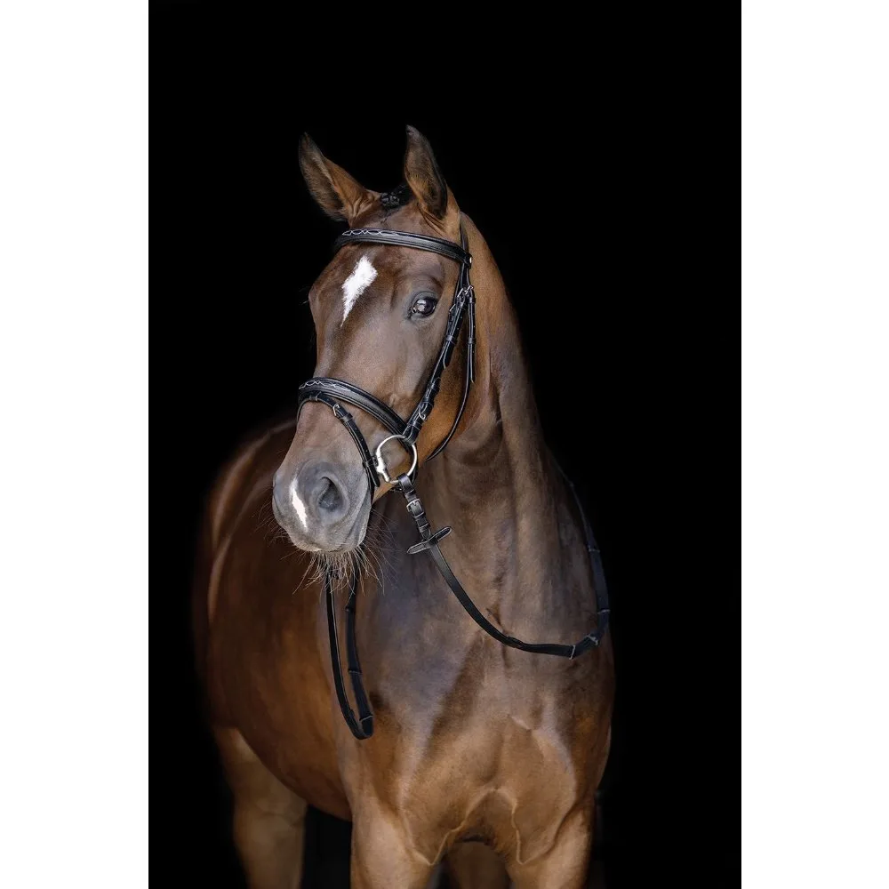 Jahaća uzda HKM Jana izrađena od kvalitetne kože. Čeona traka i njuška su mekano podstavljene. Uključeni su tkani remeni.