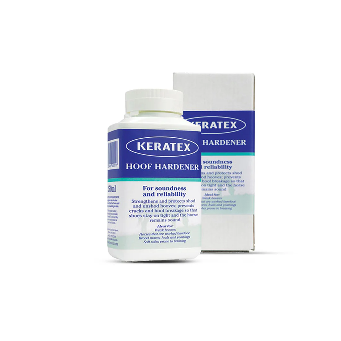 Keratex Hoof Hardener ni nadomestilo za pravilno obrezovanje kopit, ustrezno podkovanje ali pravočasno veterinarsko oskrbo. Če je kopito zelo bolno, krvavi, ima globoke poškodbe ali okužbe, se pred uporabo posvetujte z veterinarjem.