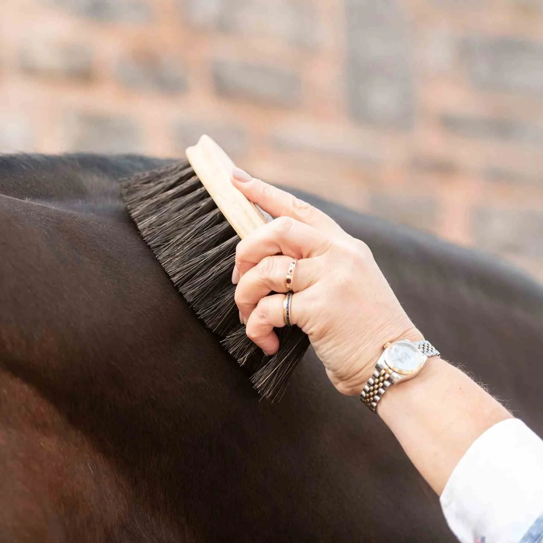 Krtača Borstiq Farm Banana Arenga – krtača za nego konj ima Arenga ščetine iz naravnih vlaken, na ukrivljeni okolju prijazni leseni podlagi, zaradi česar je enostavna za uporabo in udobne za držanje. Še posebej primerna je za majhne roke in je vsakodnevna nuja za nego konj. Ščetine Arenga dajejo gost občutek in so idealne za uporabo na vseh vrstah dlake za odstranjevanje blata in druge umazanije ali maščobe. Ščetine delujejo učinkovito in potujejo naravnost skozi dlako za najboljše rezultate.