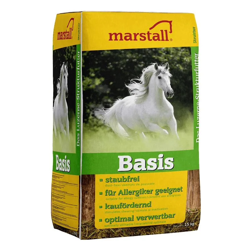 Marstall Basis je sastavljen od sjeckane Alfa-Alfe. Ukusni sastojci sirovih vlakana lucerne pojačavaju obrok na bazi žitarica, posebno poticanjem žvakanja. To povećava proizvodnju sline, što poboljšava iskorištenje hrane. Vrijedna lucerna bogata proteinima te dodana melasa i biljno ulje čine Basis bogatim izvorom sirovih vlaknina. Melasa je bogata vitaminima, mineralima, elementima u tragovima i sekundarnim biljnim tvarima, dok biljno ulje sadrži dragocjene omega-3 masne kiseline.
