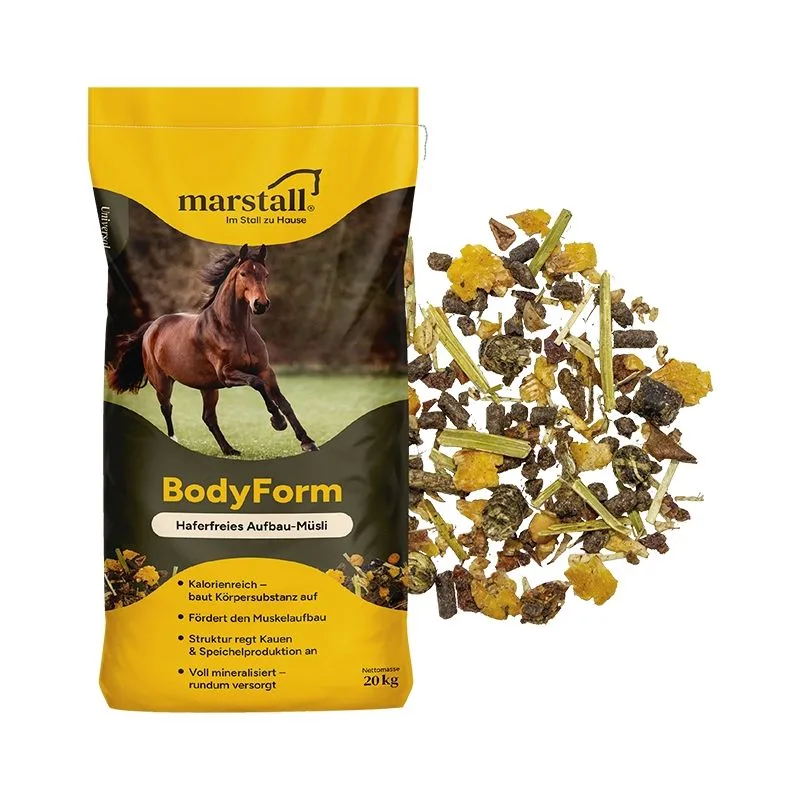 Marstall BodyForm-Müsli je idealna izbira za suhe konje, ki morajo pridobiti na telesni teži. Zagotavlja visok vir energije z relativno nizko vsebnostjo škroba, kar vodi do le zmernega dviga krvnega sladkorja in konja ne dela pretirano aktivnega. Uravnotežena receptura BodyForm-Müsli je dobra za želodec in črevesje ter vsebuje vse priporočene minerale in elemente v sledovih v zadostnih količinah.