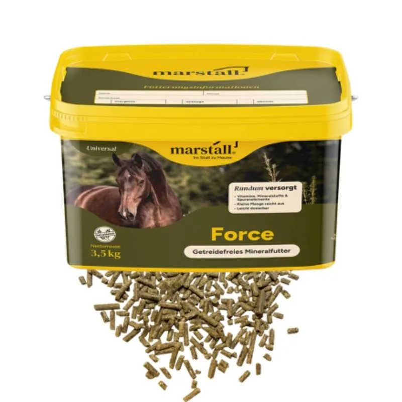 Marstall Force je posebno kvalitetna mineralna hrana za sve konje svih dobi i pasmina. Marstall Force ima širok omjer Ca:P, zbog čega je idealan za uravnoteženje prehrane s čistim sijenom i žitaricama, iako ga se može kombinirati i s drugim krmivima. To se posebno preporučuje ako konj dobiva manje količine krme od preporučenih.