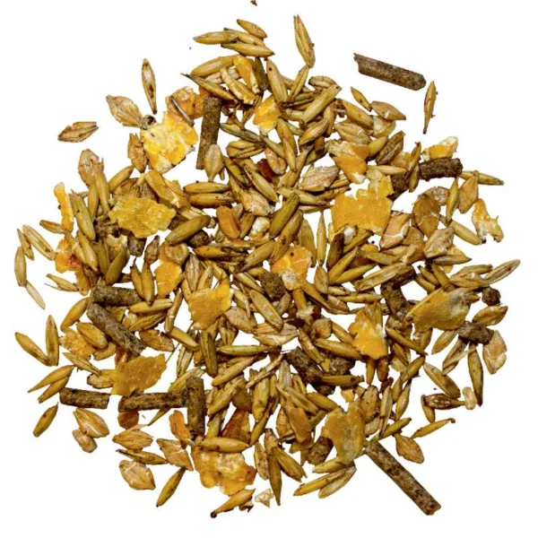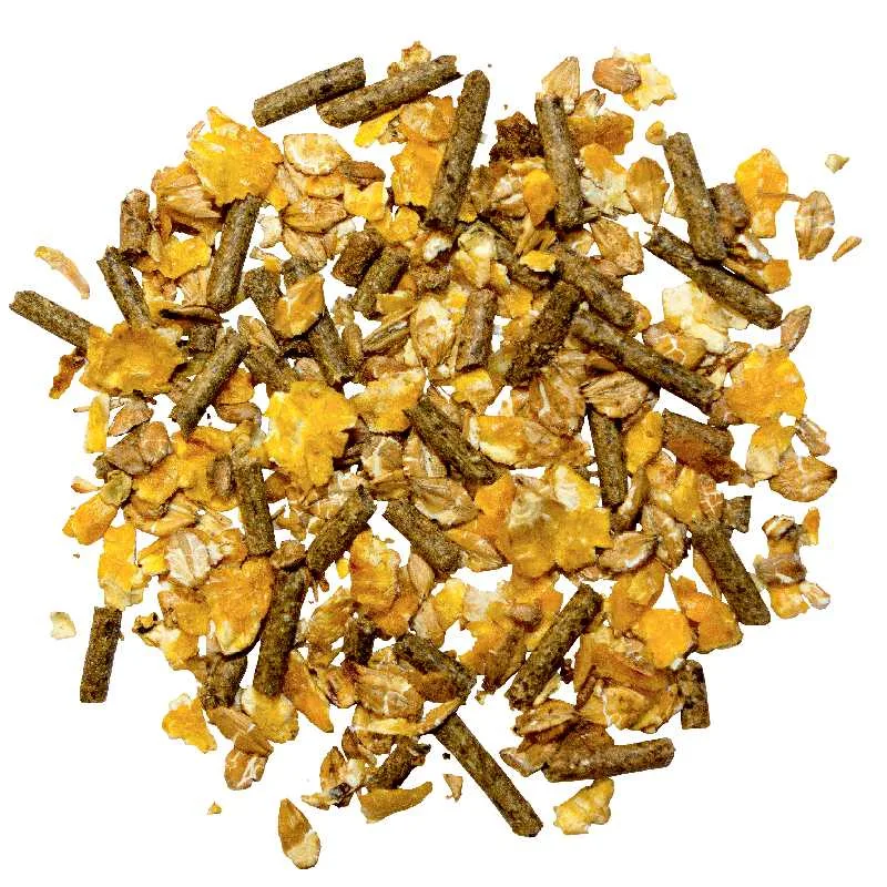 Ječmenovi kosmiči (20 %), koruzni kosmiči (20 %), pšenični zdrob, ovseni otrobi, krmna moka iz pšeničnih otrobov, posušeni melasirani rezanci sladkorne pese, kalcijev karbonat (2 %), natrijev klorid (0,8 %), koruzni gluten.