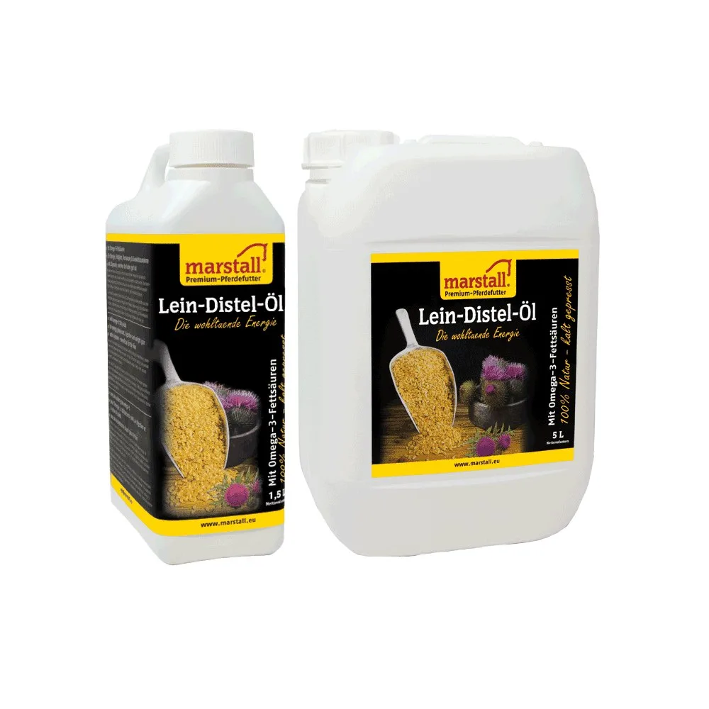 Marstall Lein-Distel-Öl (dopolnilna krmna mešanica) laneno olje zagotavlja športnim konjem, slabim jedcem in veteranom zagotavlja koncentrirano, hitro energijo.