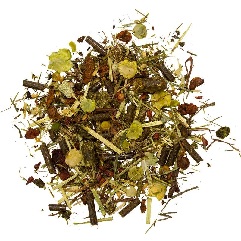 Sestava: trava, posušena z visoko temperaturo, kosmiči iz graha, laneni obrok, sušen grozdni marc, prebavljena laneno seme, rastlinsko olje (laneno seme, mleko čveka), trava, sušeno na visokoj temperaturi (Timothy), protein graha, ekstrak repice, laneno rumeno seme, celična stena pivskih kvasovk (Saccharomyces cerevisiae), magnezijev oksid, natrijev klorid, magnezijev fumarat, monokalcij fosfat, natrijev bikarbonat.