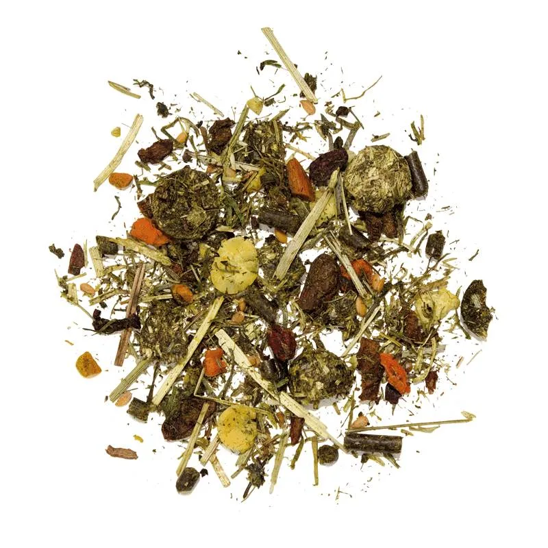 Trava, sušena pri visoki temperaturi, suhe grozdne tropine (12%), sojina moka, sojini kosmiči, rumena lanena semena, repično olje, rafinirano, strta lanena semena, moka oljne ogrščice, korenčkovi kosmiči, celične stene pivskega kvasa (Saccharomyces cerevisiae) ( 1,3%), kalcijev karbonat, korenina kurkume (narezana) (0,5%), rastlinsko olje (laneno olje, olje mlečnega badlja).