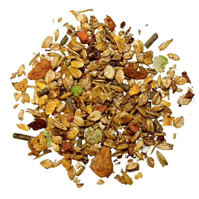 Sestava: ječmenovi kosmiči (34 %), koruzni kosmiči (27 %), ovseni kosmiči (10 %), suhi grozdni trop (6 %), laneno seme (5 %), melasa pese (4,5 %), pivski kvas (3 %), stisnjeni zdrob lanenega semena (3 %), grahovi kosmiči (1,5 %), pivski tropin (1,2 %), korenčkovi kosmiči (1 %), sušena travniška bilnica (1 %), natrijev klorid (0,6 %), mleta morska alga (0,5 %), kalcijev karbonat (0,5 %), monokalcijev fosfat (0,3 %), magnezijev oksid (0,25 %).
