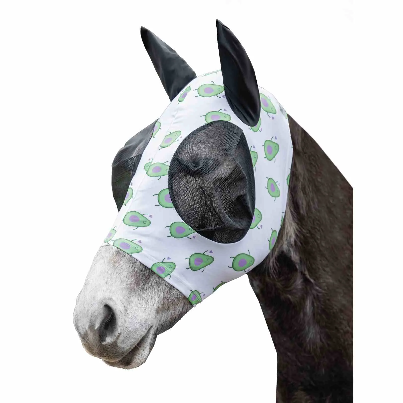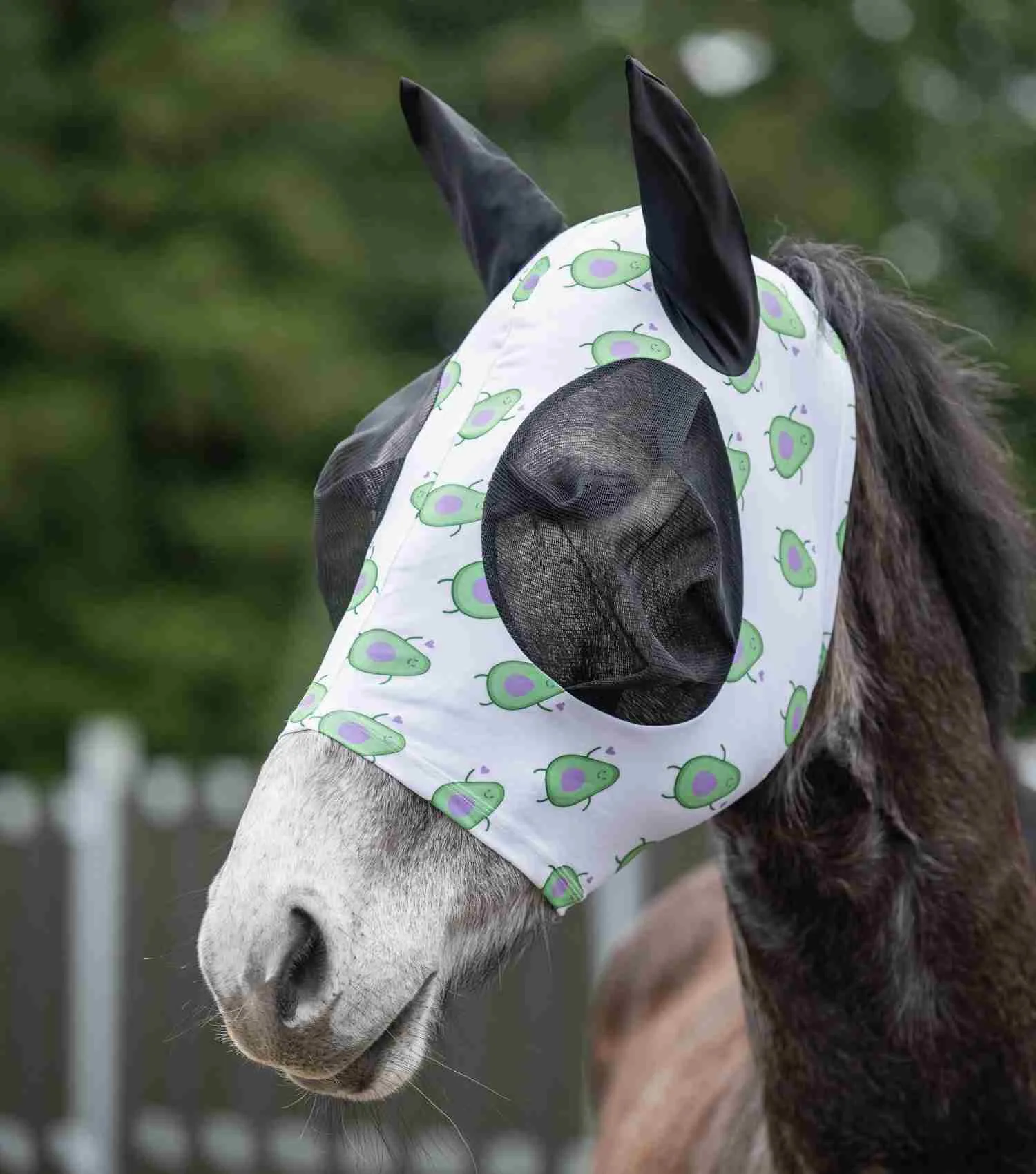 Maska proti mrčesu HKM Avokado <3 -elastična zaščitna maska proti mrčesu združuje zanesljivo zaščito in igriv dizajn. Elastičen, zračen raztegljiv material učinkovito odvrača nadležen mrčes ter se tesno prilega brez omejevanja konja. S trendovskim vzorcem doda živahen barvni poudarek. Vgrajena UV-zaščita s faktorjem zaščite pred soncem 50+ konja ščiti pred močnim soncem, zato je maska idealen spremljevalec v vročih dneh.