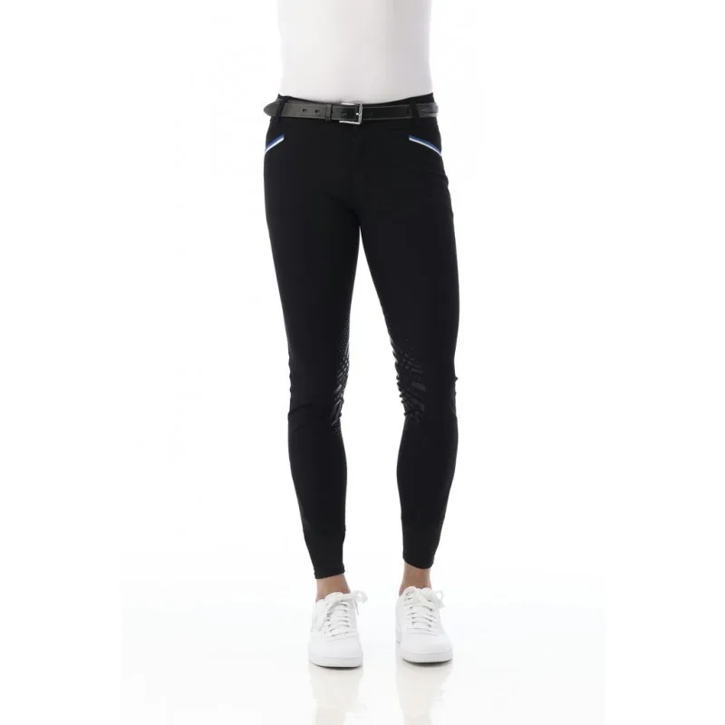 Te jahalne hlače imajo vse, kar moški potrebuje: podporo, udobje, zračnost, vzdržljivost in klasičen kroj. Žepi spredaj obrobljeni z ravnim modro-belim trakom in skriti žepi zadaj. Silikon je odtisnjen samo na kolenih. Spodnji del hlačnice iz elastana.