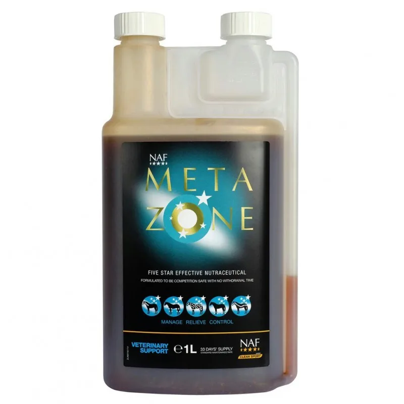 NAF Metazone tekočina – Formulirana posebej za podporo protivnetnnim procesom. NAF Five Star Metazone je učinkovit nutricevtik s petimi zvezdicami za zdravljenje konj, ki potrebujejo nekaj dodatne podpore. Metazon je sestavljen iz sinergistične mešanice sestavin, ki podpirajo naravne protivnetne poti. Rastlinske fitokemikalije, ki sestavljajo ta izdelek, nudijo podporo tam, kjer jih telo potrebuje, pa naj bodo to sklepi, kopita, kite, vezi, mišice ali koža.