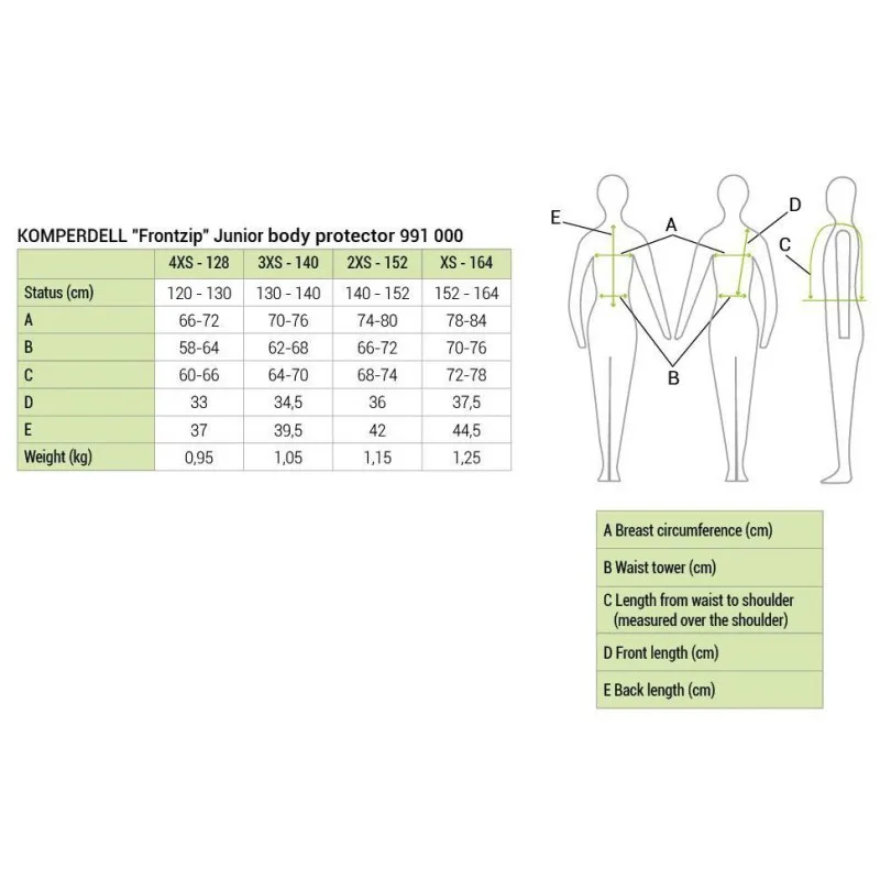 Večslojnost in posebej mehka pena zagotavljata popolno prileganje. Poleg tega ima brezrokavnik preprost dizajn in ga je zelo enostavno obleči in sleči. Otroški zaščitni jopič Komperdell Frontzip je izjemno lahek in prilagodljiv ščitnik, najboljše varnostne vrednosti za zaščito prsnega koša. Z zadrgo spredaj, integrirano regulacijo širine, enostaven za pranje in nego, izdelan v Avstriji, je najboljše razmerje med ceno in kavaliteto.