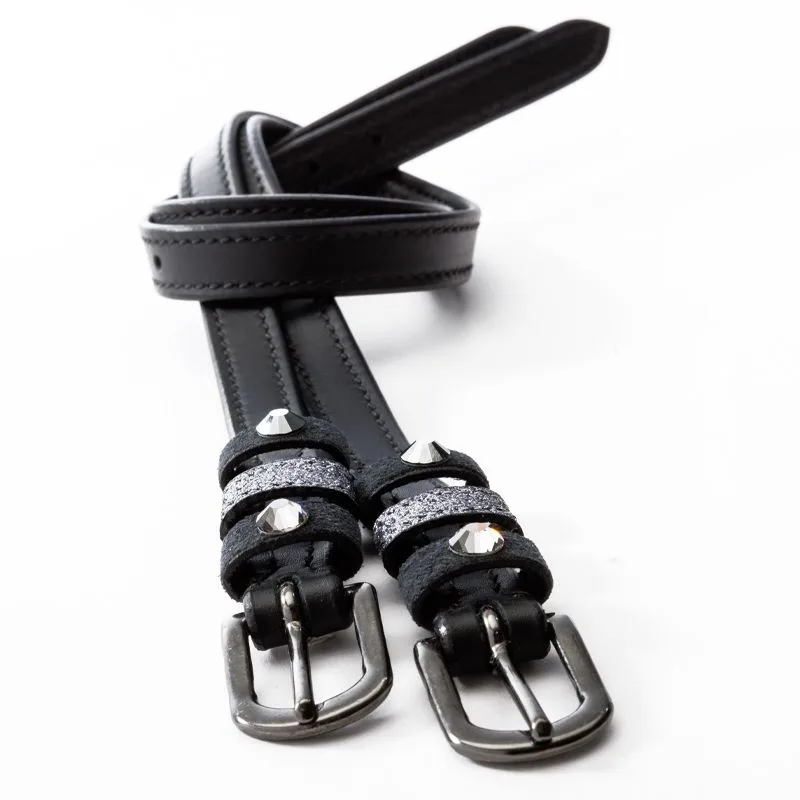 Paščki za ostroge »Grey« iz mehkega in trpežnega kakovostnega usnja, okrašeni s sivimi bleščicami, zaponkami in bleščečimi črtami na usnjenih zankah. V kompletu po dva.