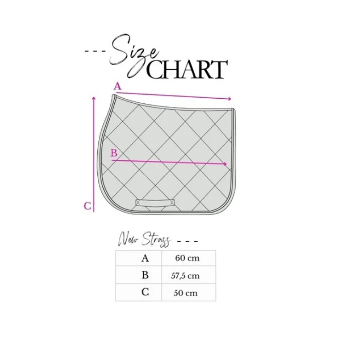 Podsedelnica Pénélope New Strass je razkošna in hkrati funkcionalna podsedelnica za vsakodnevni trening in tekmovanja, zasnovana za jahače, ki želijo eleganten, “show-ready” videz in urejen komplet opreme. Ima debelo prešito polnilo (v obliki rombov) in žametno zunanjo površino, ki daje prestižen videz ter prijeten, mehak otip. Ob robu je okrašena z okrasno vrvico in dvema vrstama kristalčkov, na levi strani pa je prepoznaven Pénélope logotip iz bleščečih kristalov, zato se lepo ujema z ostalo kolekcijo in na tekmah res izstopa.