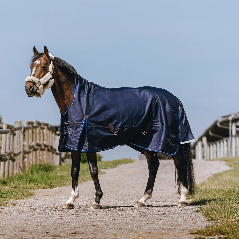 EQUITHÈME Classic 1200D High Neck – 200 g zimska vanjska deka je lagana, vodootporna i iznimno izdržljiva deka s visokim vratnim dijelom za dodatnu zaštitu od vjetra i kiše. Vanjski dio od 1200D ripstop poliestera dobro odolijeva ogrebotinama i svakodnevnoj uporabi, a 200 g punjenja pruža taman dovoljno topline za hladne dane ili za konje koji se brzo zagrijavaju. Visoki kroj lijepo obujmljuje vrat, smanjuje prodor vjetra i kišnih kapi preko ramena te pomaže u održavanju suhe, opuštene gornje linije. Unutrašnjost je glatka za minimalno trljanje dlake, kroj s ramenim naborima omogućuje slobodu kretanja, a ispod stabilnost osiguravaju križni remeni, dugi repni preklop i elastični stražnji remeni. Sprijeda su praktične postavke sa sigurnim zakopčavanjem, svi šavovi su toplinski zatvoreni za pouzdanu vodootpornost i prozračnost. Deka je odličan izbor za svakodnevnu upotrebu na pašnjaku i u ispustu, kada želite robusnu 1200D zaštitu s lagodnim 50 g udobnosti i većim vratnim prekrivanjem.