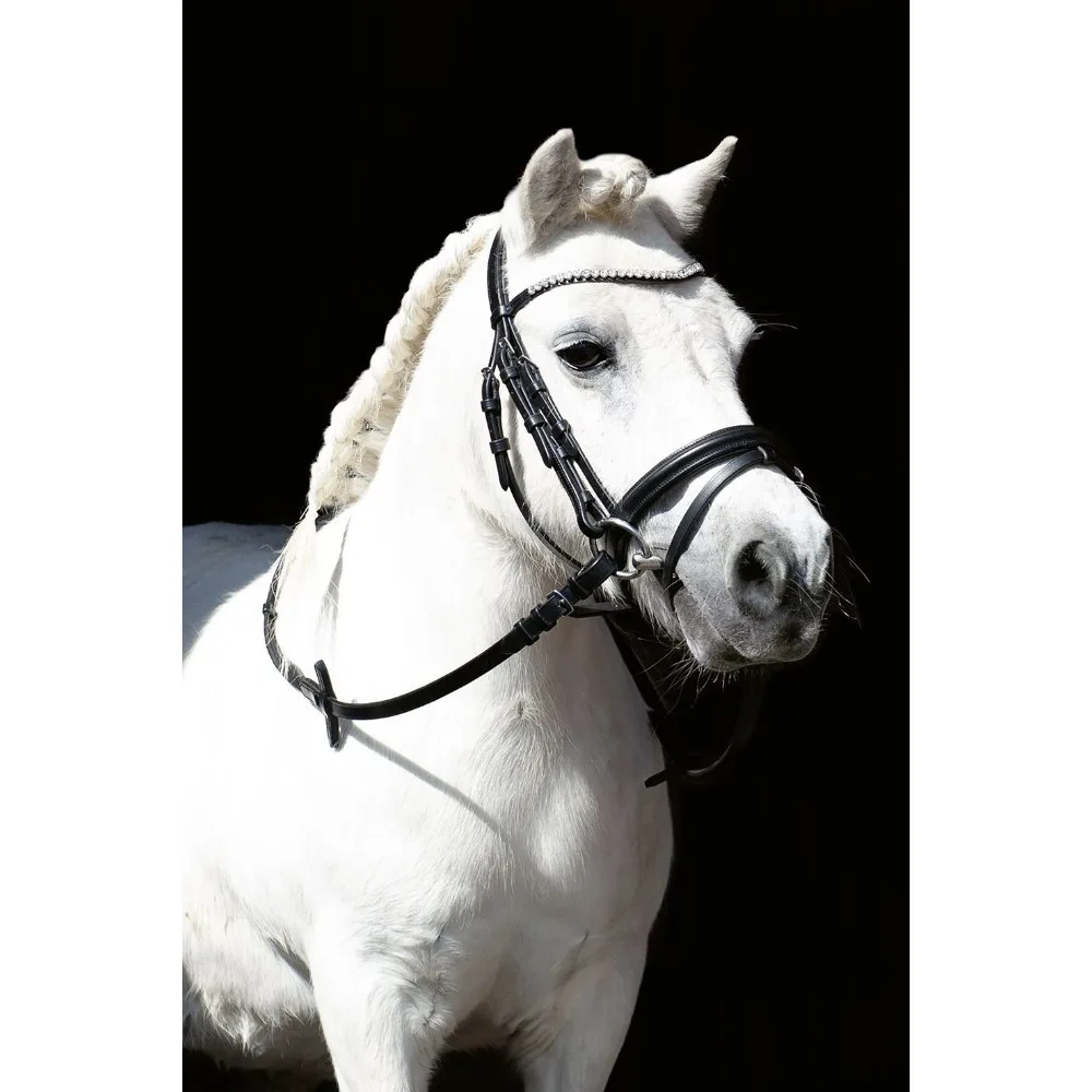 Pony uzda HKM Shetty Diamond izdelana iz usnja z močnimi zaponkami. Priložene so tkane vajeti. Lepo okrašen čelnik s kamenčki.