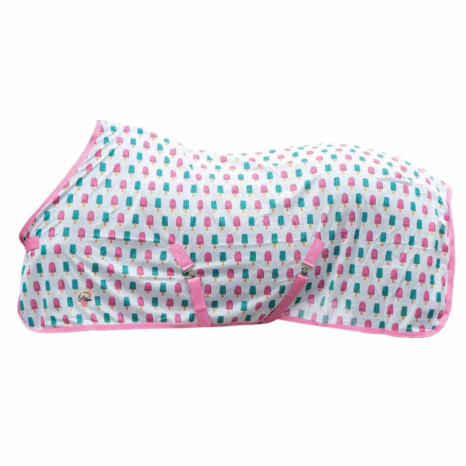 Odeja proti mrčesu Ice Cream nudi optimalno zaščito pred muhami in insekti ter je hkrati pravi modni dodatek. Nastavljivi in snemljivi križni pasovi poskrbijo za varno prileganje in največje udobje za konja. Zabaven potisk – po izbiri z lučkami, avokadi ali rumenimi rački – prinaša svežino v hlev in na pašo. Ujemajoča se zaščitna maska proti mrčesu je na voljo posebej in omogočata popolno usklajen komplet.