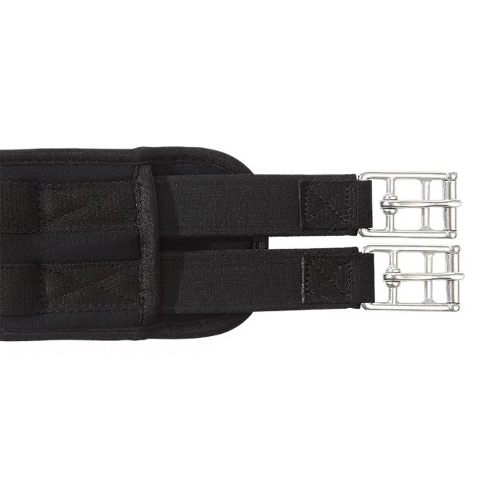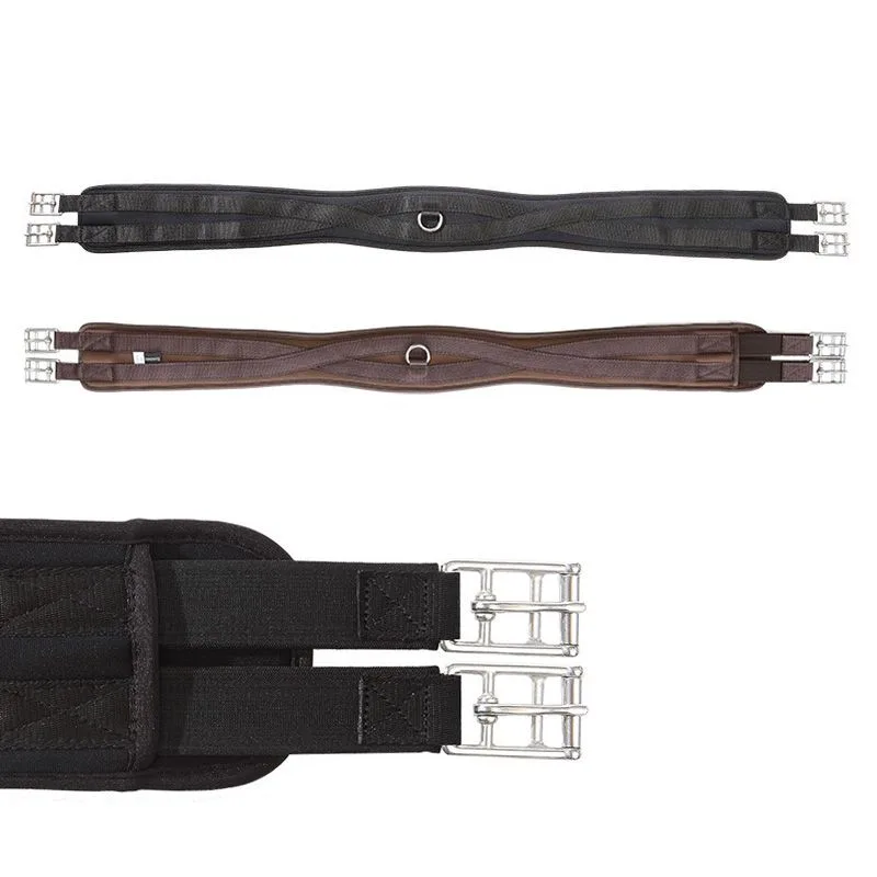 Sedelni pas Kavalkade Memory Foam z elastiko, je spominski pas enostavne oblike in ima na sredini D-obroček za pritrditev pomožnih vajeti, martingalov in oprsnic.