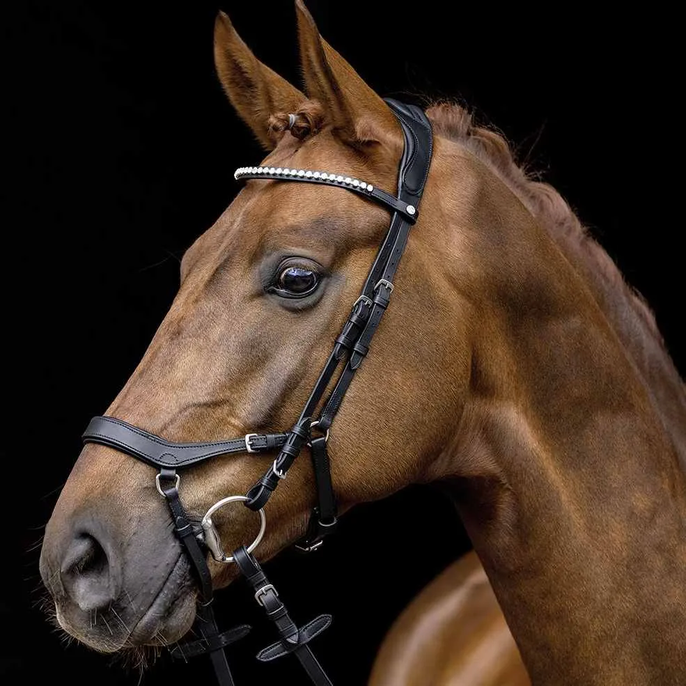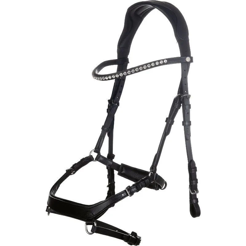 Uzda HKM Pro Anatomic je izdelana iz visokokakovostnega usnja. Angleški nosnik je anatomsko oblikovan. Nosnik in naglavni del uzde sta mehko podložena. Poleg tega širok naglavni del z izrezi za ušesa preprečuje pritisk na občutljive predele konjske glave. Čelnik uzde je okrašen s sintetičnimi diamanti. Vajeti so narejene iz tkanega materiala z usnjenimi zamaški. Uzda Pro Anatomic je na voljo v dveh barvah.