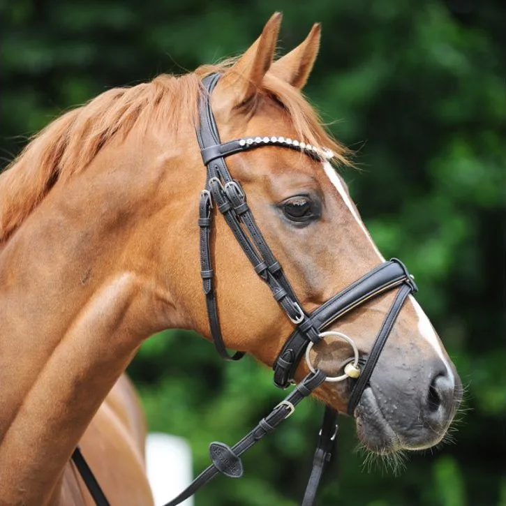 Uzda Kavalkade Cortica Vegan ima engleski kombinirani nosnik s anatomskim naglavnim dijelom. Potonji i nosnik su mekano podloženi. Uzda je podesiva s obje strane. Sjajan čeonik i uska bež traka duž nosnika odlično privlače poglede.