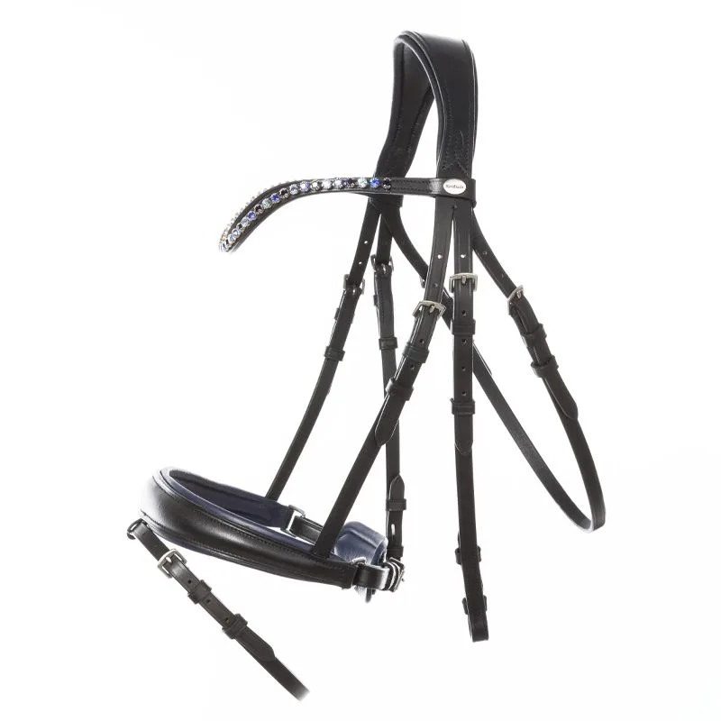 Uzda Kavalkade Ocean KavalSH4 – Modna uzda “Ocean” KavalSH4 s temno modro obrobljenim nosnikom in bleščeče modrimi kamenčki na čelniku je izdelana iz odličnega usnja in jo je mogoče prilagoditi na obeh straneh. Zatilni del je anatomsko oblikovan in zelo širok ter nudi večjo svobodo za ušesa. Nosnik je mehko podložen in stožčast. Uzda je dostavljena z gumiranimi vajetmi z zaporami (16 mm).