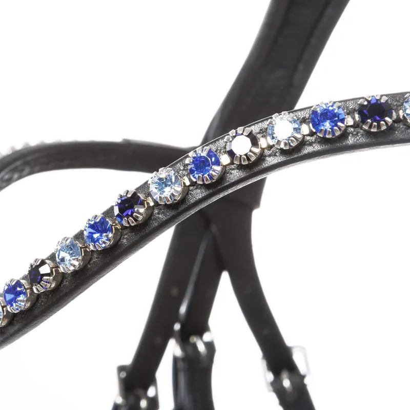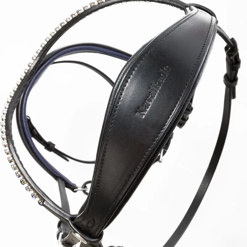 Uzda Kavalkade Ocean KavalSH4 – Moderna uzda “Ocean” KavalSH4 s tamnoplavim obrubljenim nosnikom i sjajnim plavim kamenčićima na naglavnoj traci izrađena je od izvrsne kože i može se podesiti s obje strane. Potiljni dio je anatomski oblikovan i vrlo širok te nudi veću slobodu za uši. Nosnik je mekano podstavljen i stožast. Uzda se isporučuje s gumiranim vodilicama sa stoperima (16 mm).