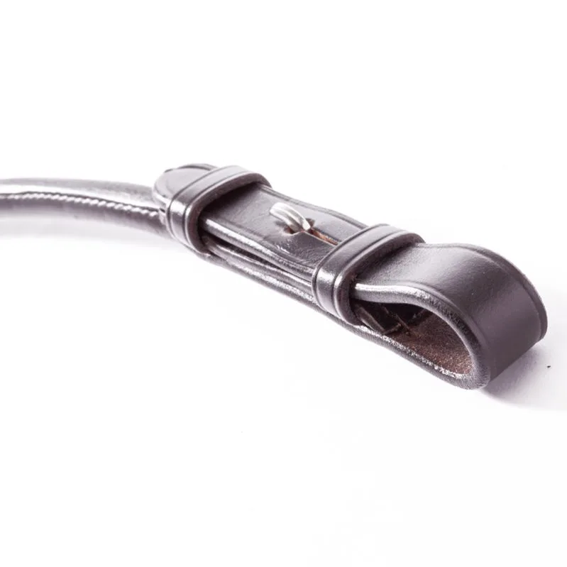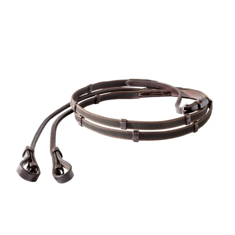 Vajeti Kavalkade Softgrip združujejo mehko oljeno usnje na zgornji strani in gumirano spodnjo stran za varen oprijem v vseh razmerah. Okroglo šivana (rolled) izdelava daje eleganten videz in fino lego v roki, ozka širina 16 mm pa poskrbi za občutek natančnosti tudi pri manjših dlaneh. Pet usnjenih postankov na vsaki strani pomaga ohranjati konstantno dolžino vajeti in stabilen stik