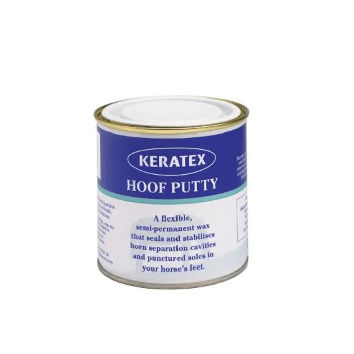Keratex Hoof Putty je visoko kakovosten vosek oz. masa za zapolnjevanje in zaščito votlin v kopitu. Uporablja se za zapiranje lukenj po abscesih, razpokah ali ločitvah bele linije in učinkovito preprečuje vdor umazanije, kamnov ter vlage. Masa se po nanosu oprime notranjih sten votline in se ne izpira, zato kopitu nudi dolgotrajno zaščito in spodbuja naravno celjenje.