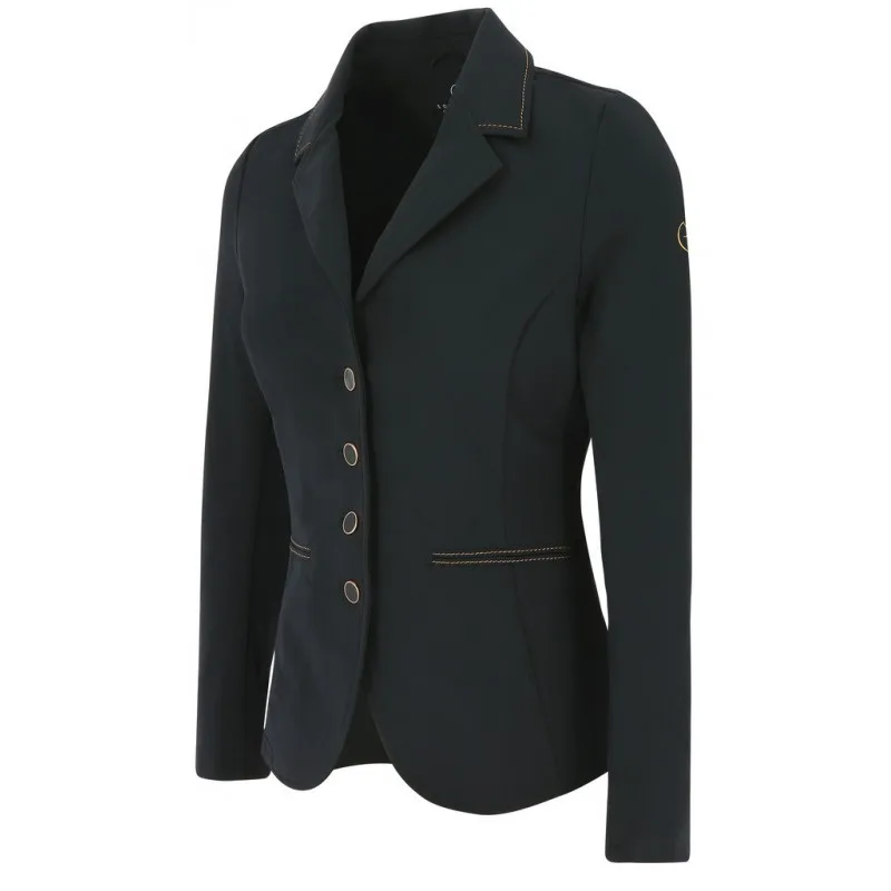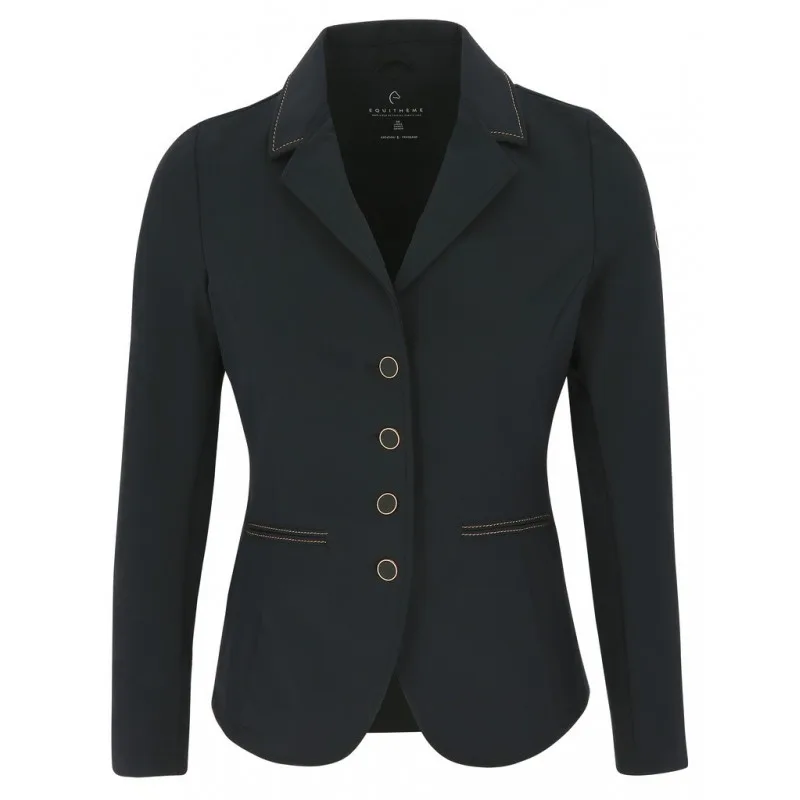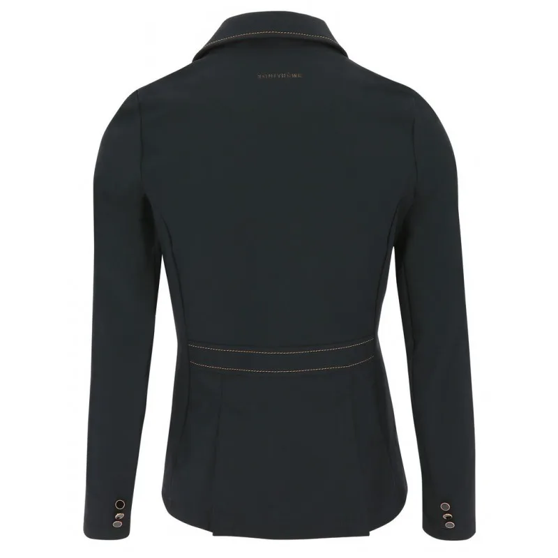 Ženski tekmovalni suknjič EquiTheme Bale, je lahek, prožen in zelo elastičen suknjič, kateri se vam bo zelo lepo prilegal. Glavna tkanina je super zračna, vpija znoj in se hitro suši. Kontrastni šivi na zadnji strani lepo poudarijo pas. Kontrastni šivi, obrobe pri gumbih so v rose-gold barvi. Zapenjanje na gumbe.